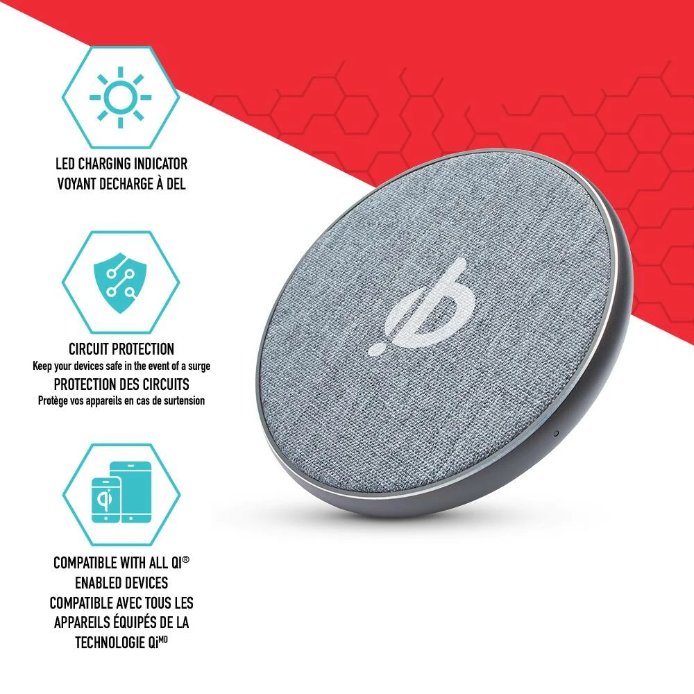 Charge your phone and enhance your décor style with the Bluehive Fabric Wireless Charging Pad. This wireless charging pad has fast-charging capabilities, saving you time throughout the day. This phone charger is made with a neutral fabric inlay, creating a clean, sophisticated aesthetic. The anti-slip ring keeps your phone in place while charging. An LED charging indicator on the charging pad helps you monitor the status of the charging process. Useful for all Qi-enabled devices, this wireless charger is compatible with many iPhone, Samsung Galaxy, LG, Microsoft Lumia Google Nexus and Blackberry models. This portable charger comes with a USB cord, allowing you to easily stay charged and connected while at home or at the office. Keeping you connected, in the moments that matter most.