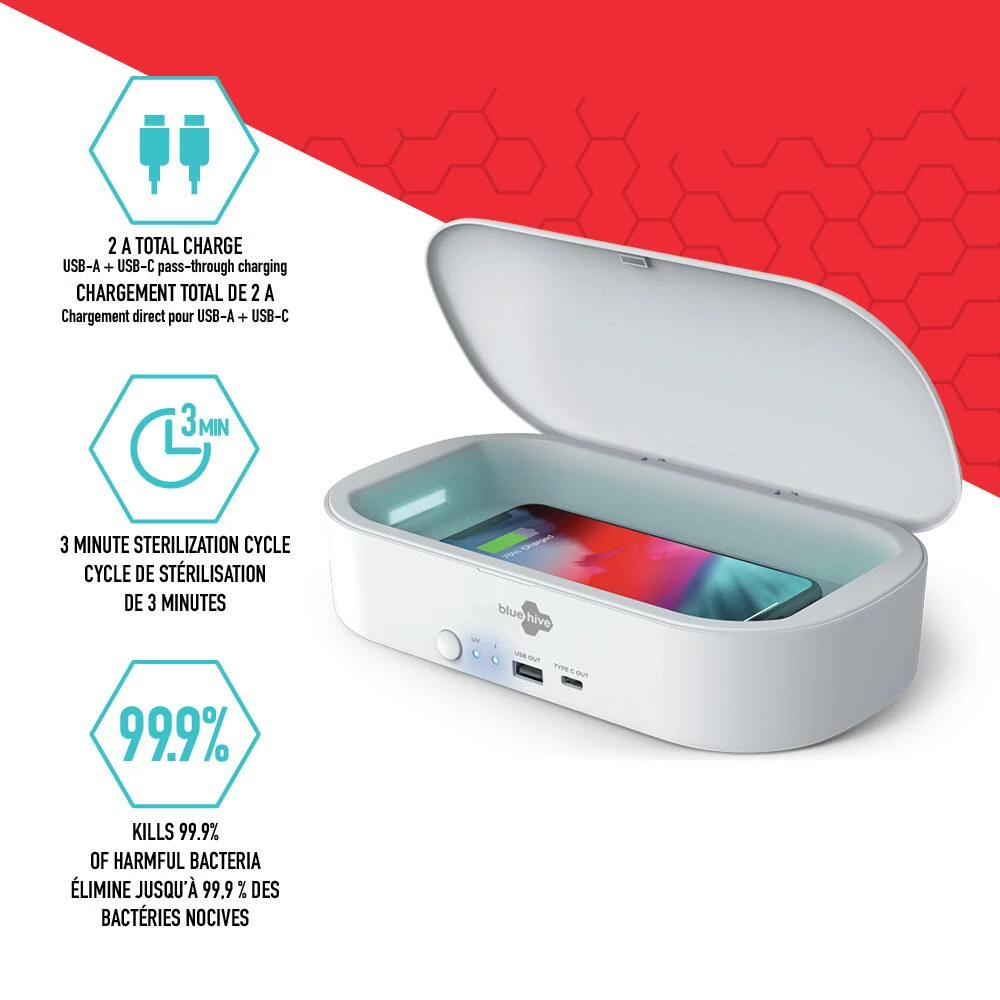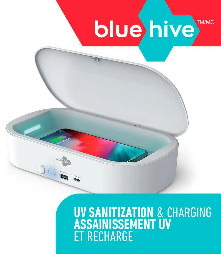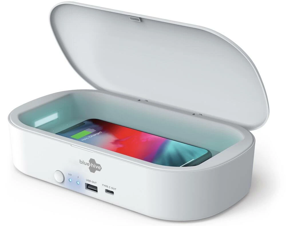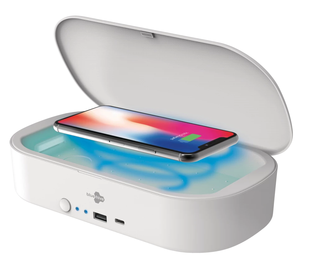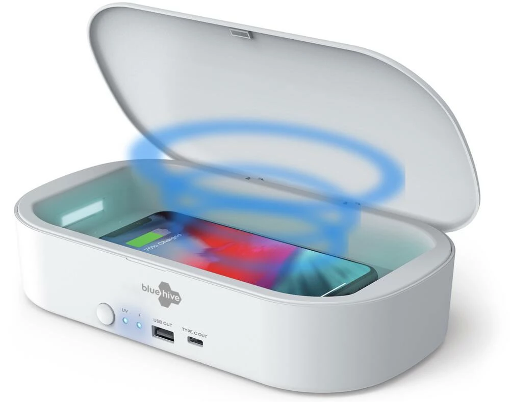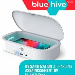 - Bluehive UV Phone Sanitizer with Wireless Charger features a 3-minute sanitization cycle