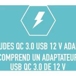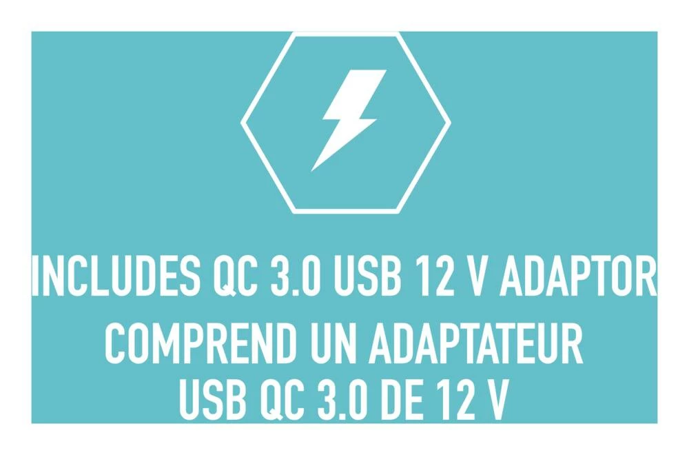 - Includes QC3.0 USB 12V Adapter